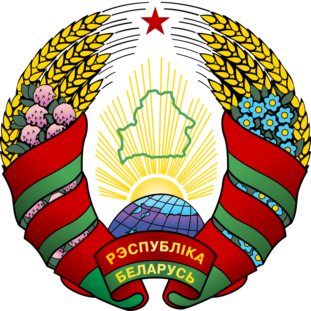 Государственный герб Республики Беларусь представляет собой размещенный в серебряном поле золотой контур Государственной границы Республики Беларусь, наложенный на золотые лучи восходящего над земным шаром солнца. Вверху поля находится пятиконечная красная звезда. Герб обрамлен венком из золотых колосьев, переплетенных справа цветками клевера, слева – цветками льна. Венок трижды перевит с каждой стороны красно-зеленой лентой, в средней части которой