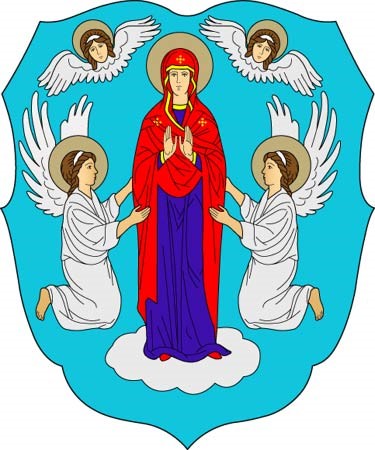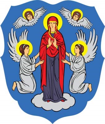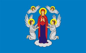 Флаг города Минска представляет собой прямоугольное полотнище голубого цвета с соотношением сторон 1:1,5, в центре лицевой стороны которого находится изображение Пречистой Девы Марии, стоящей на белом облаке, с поднятыми руками в благословляющем жесте в одеждах красно-синего цвета, которую справа и слева поддерживают два ангела, стоящих на коленях, в белых одеждах с белыми крыльями. С двух сторон над головой Богоматери парят два херувима с белыми крыльями. Над головами Богоматери, ангелов и херувимов - желтые нимбы. |