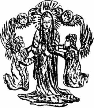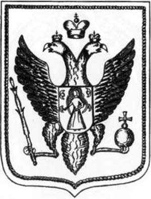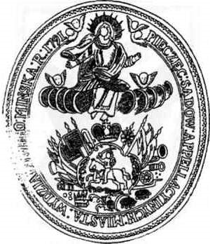 Герб Минска на печати Минского губернского дворянского депутатского собрания. На груди двуглавого российского орла размещен щит с изображением Девы Марии, которая одета по моде конца XVIII — начала XIX в. — в платье с кринолином